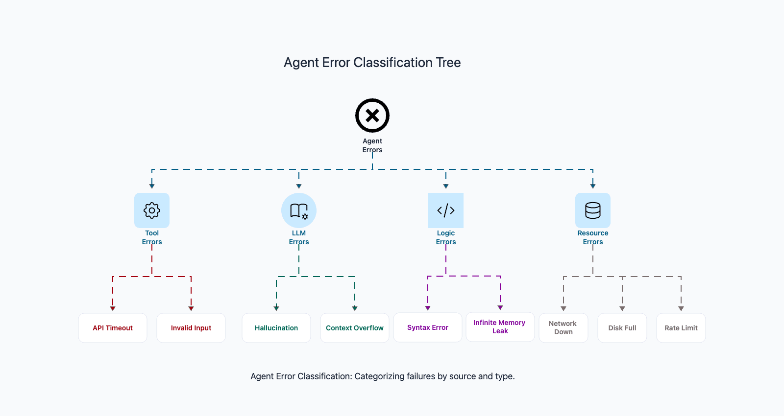 Traditional software fails in predictable ways: a function throws an exception, a database query times out, a network request returns a 500. You can enumerate the failure modes and write handlers for each one. Agents fail in all of those ways plus entirely new categories: the LLM generates unparseable output, hallucinates a tool that does not exist, gets stuck in a reasoning loop, or silently misunderstands the task. Robust error handling for agents requires a taxonomy that covers both the familiar failures and the novel ones.
