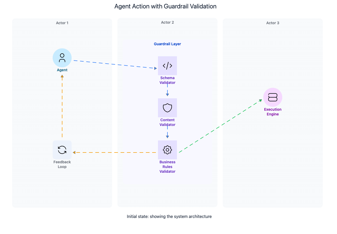 This architecture has two benefits. First, the agent can recover from guardrail rejections because they look like normal tool errors. The agent reads the error, adjusts its approach, and retries. Second, the guardrail layer can be updated independently of the agent. New validation rules can be added without modifying the agent's prompt or code.