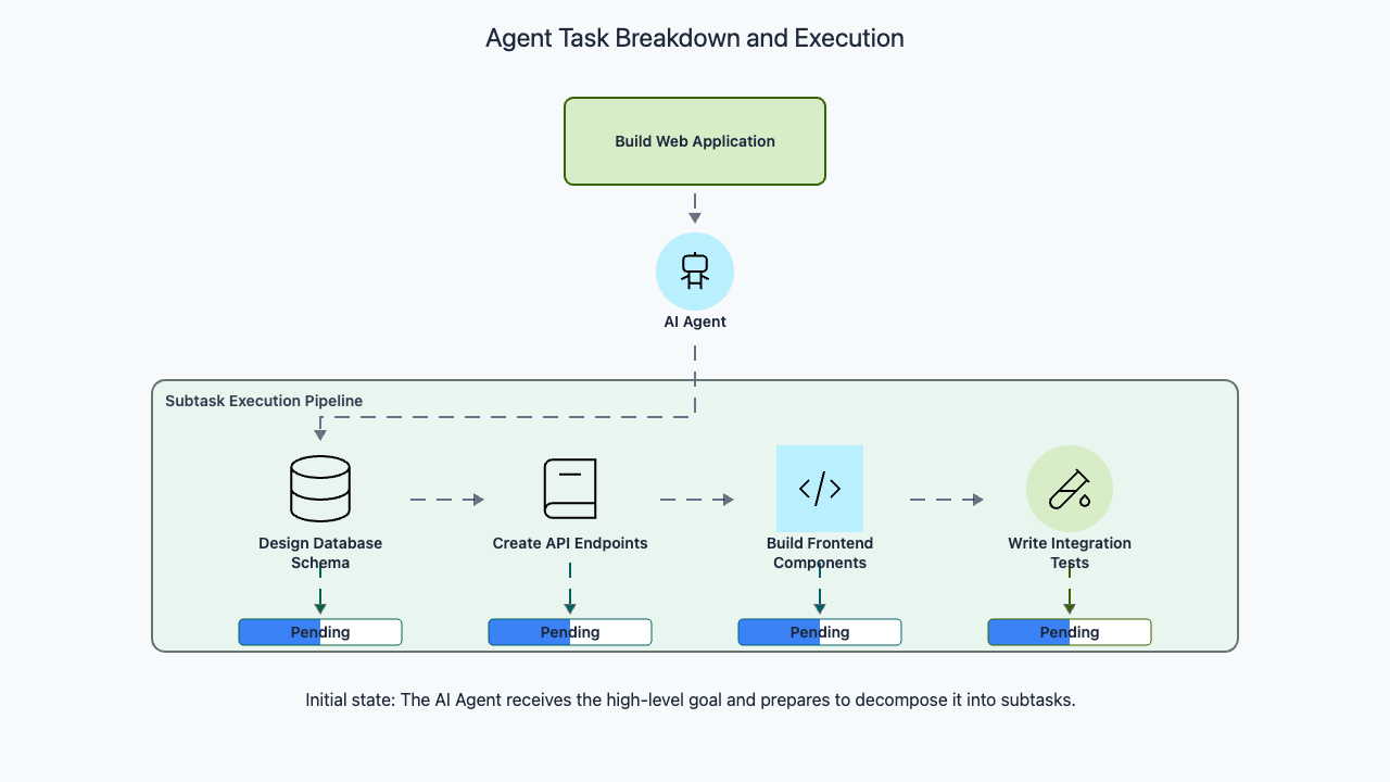 When you ask an agent to "build a web application with user authentication, a product catalog, and a shopping cart," it cannot do this in one step. The task is too complex, with too many interdependent parts. The agent needs to decompose it into smaller, manageable subtasks that can be executed sequentially or in parallel.