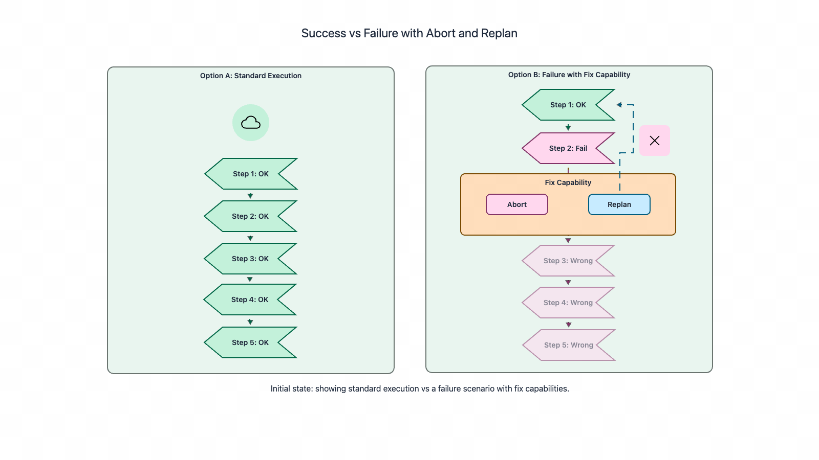 The fundamental weakness is brittleness. The plan is generated based on assumptions about the environment. If those assumptions are wrong (the file does not exist, the API returns an unexpected format, a dependency is missing), the plan breaks. A rigid plan-then-execute agent either fails outright or continues executing steps that no longer make sense.