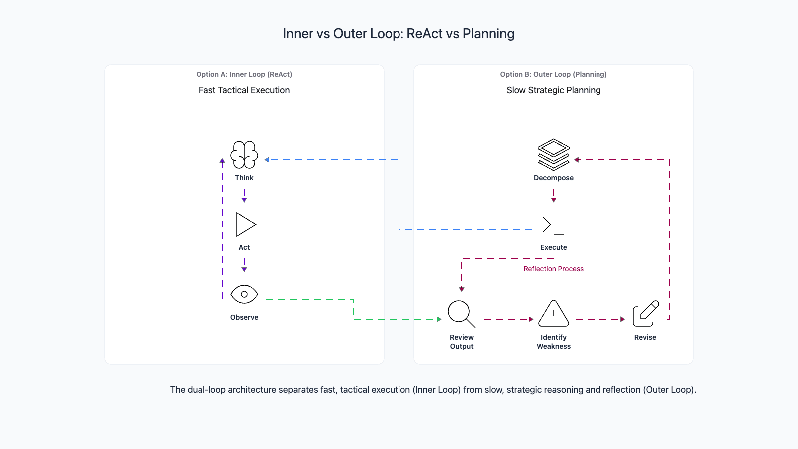 Reflection happens at both levels. Inner-loop reflection reviews individual actions ("Did this code change fix the bug?"). Outer-loop reflection reviews overall progress ("I have completed 4 of 7 subtasks. Am I on track? Should I adjust the plan?"). The most capable agents use both, with the outer loop catching strategic errors that the inner loop misses.