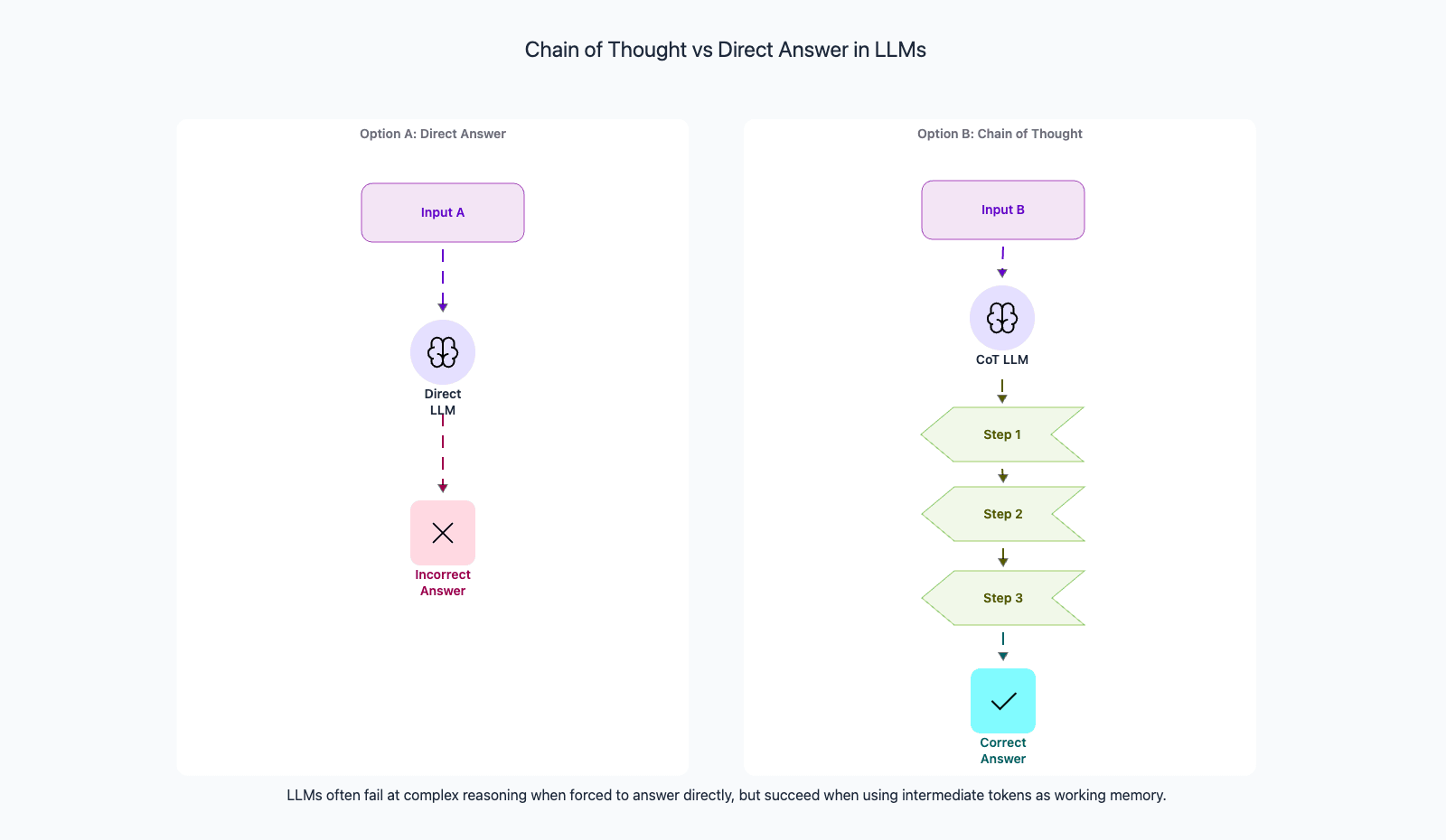 The key insight is that output tokens serve as working memory. An LLM generates one token at a time, and each new token can attend to all previous tokens. Without chain-of-thought (CoT), the model must compute the entire answer in a single forward pass, the equivalent of solving a multi-step problem in your head without writing anything down. With CoT, each intermediate step becomes part of the context, and the model can reference its own reasoning when computing the next step.