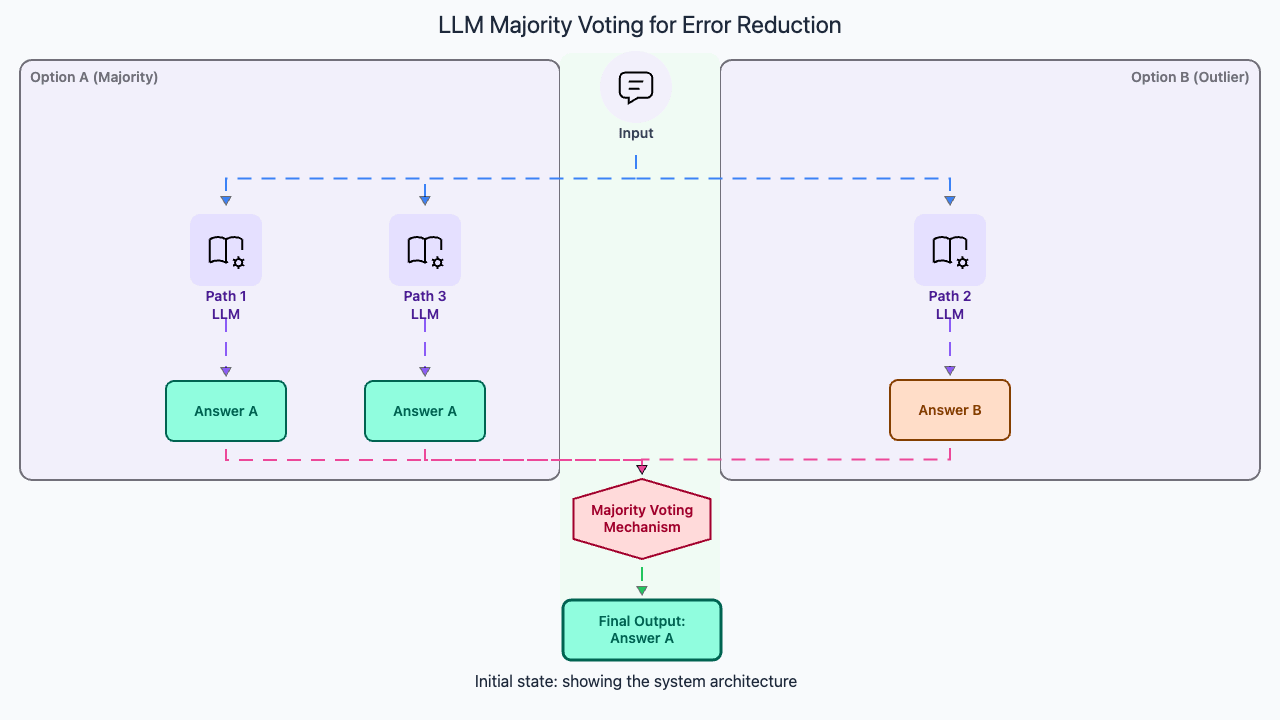 The intuition is simple. If you ask three people to independently solve the same math problem and two of them get 42 while one gets 37, you trust 42. Self-consistency applies the same logic to LLM reasoning chains. Each chain reasons differently. Different intermediate steps, different phrasing, different order of operations, but correct reasoning tends to converge on the same answer while errors are random and diverge.