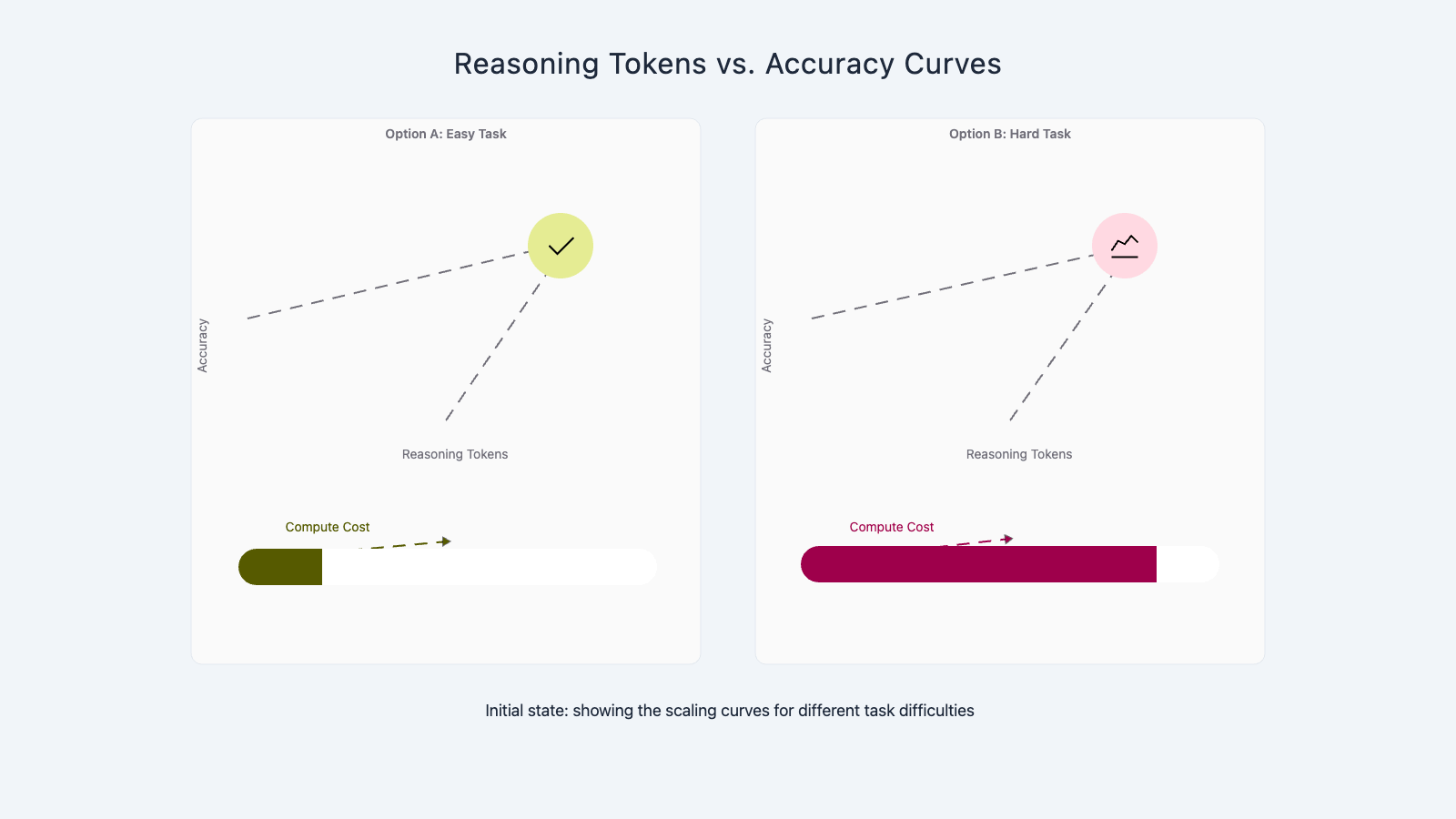 The relationship between reasoning depth and accuracy is not linear. For easy tasks, adding reasoning tokens gives diminishing returns. The model is already correct without them. For medium tasks, CoT provides a significant accuracy boost at moderate cost. For hard tasks, extended thinking provides another jump in accuracy but at 10-100x the token cost. The optimal strategy depends on your task distribution. If 80% of tasks are easy, 15% medium, and 5% hard, applying deep reasoning to everything wastes 80% of your budget on tasks that do not benefit.