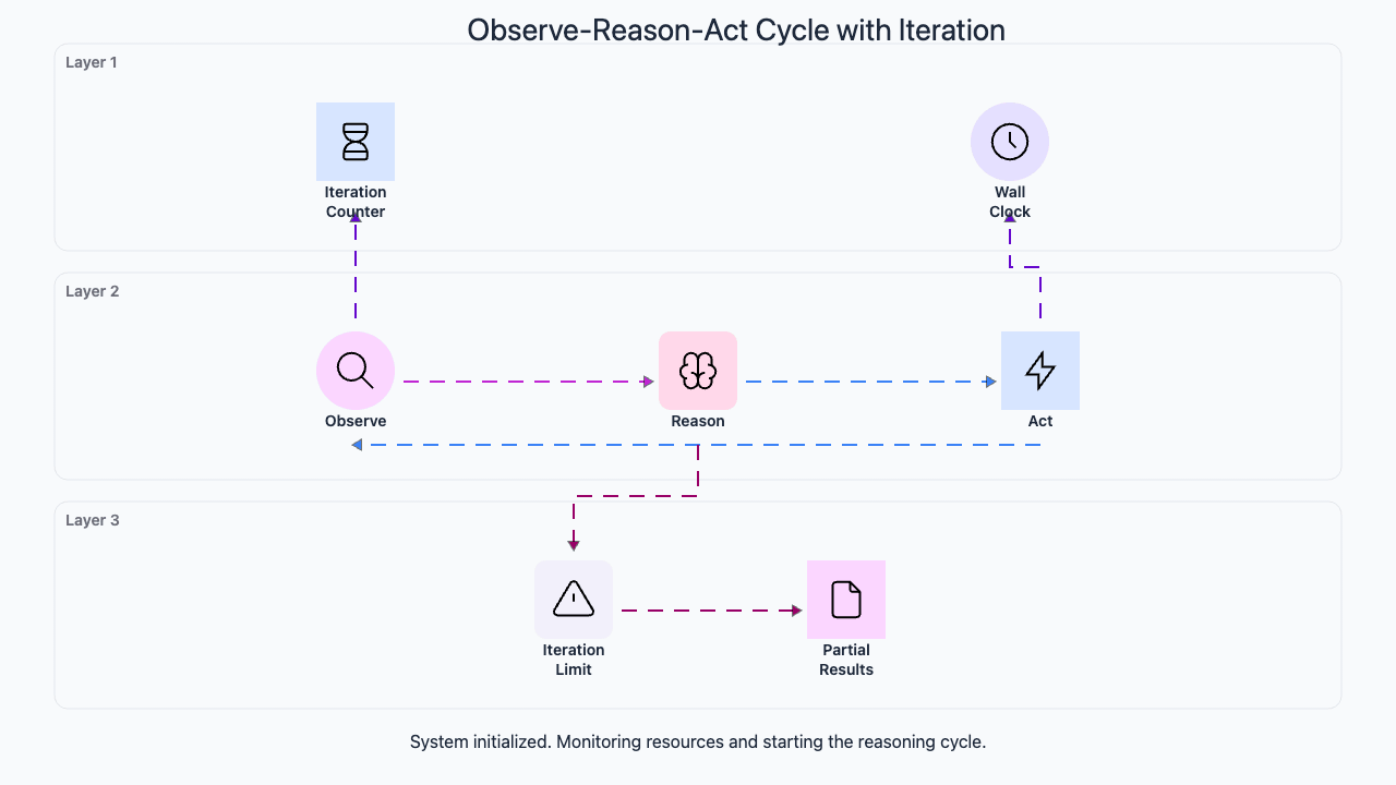 - Max iterations: cap the loop at a reasonable limit (10-20 steps for most tasks) to prevent infinite loops and runaway costs. When the cap is hit, return the best result so far with a warning.