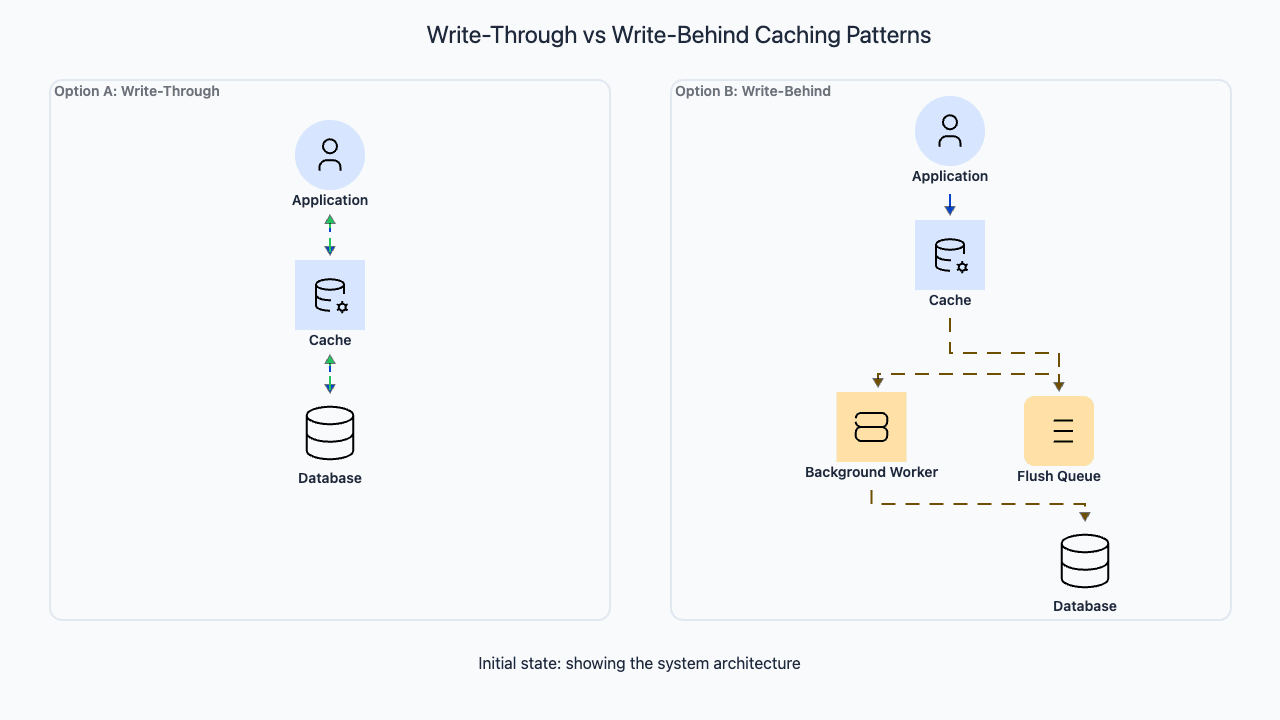 | Complexity | Low (get/set/delete) | Medium (dual-write ordering) | High (queue, flush, retry) |