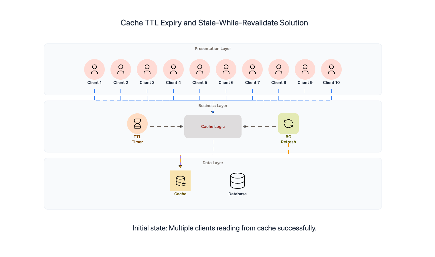 - Thundering herd: When a popular key expires, hundreds of concurrent requests all miss and stampede the database simultaneously.