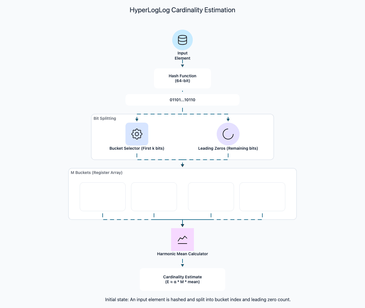 HyperLogLog estimates the number of distinct elements in a dataset. The core idea: hash each element to a binary string, and track the maximum number of leading zeros observed. More leading zeros imply more distinct elements (like flipping coins — the more flips, the more likely you are to see a long streak of heads).
