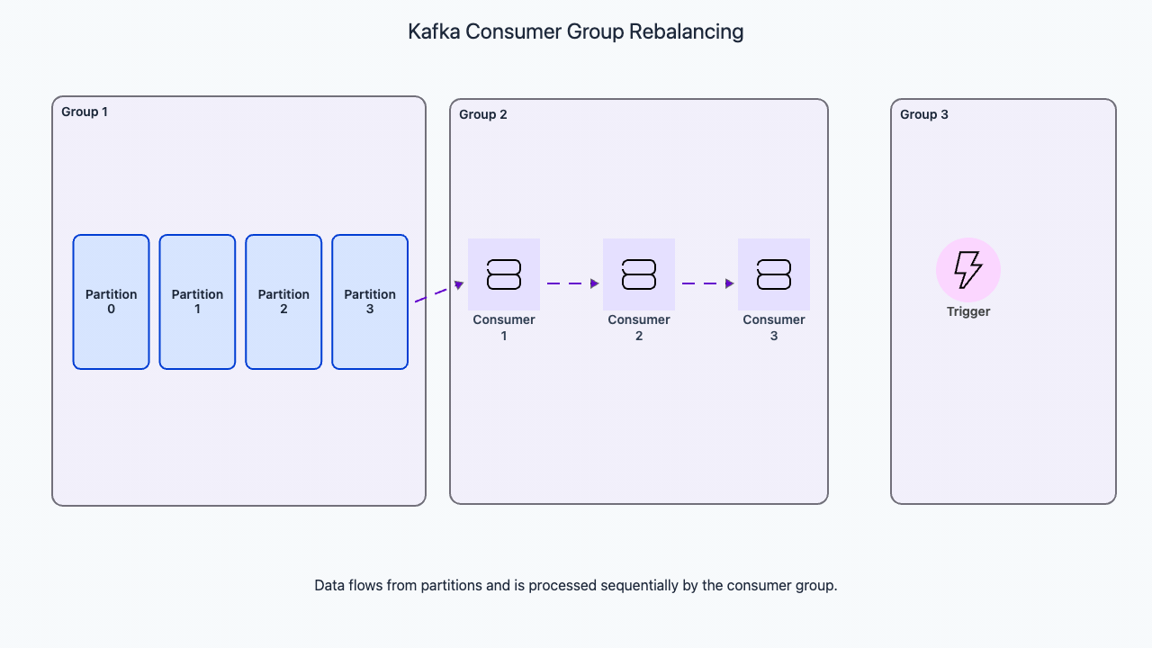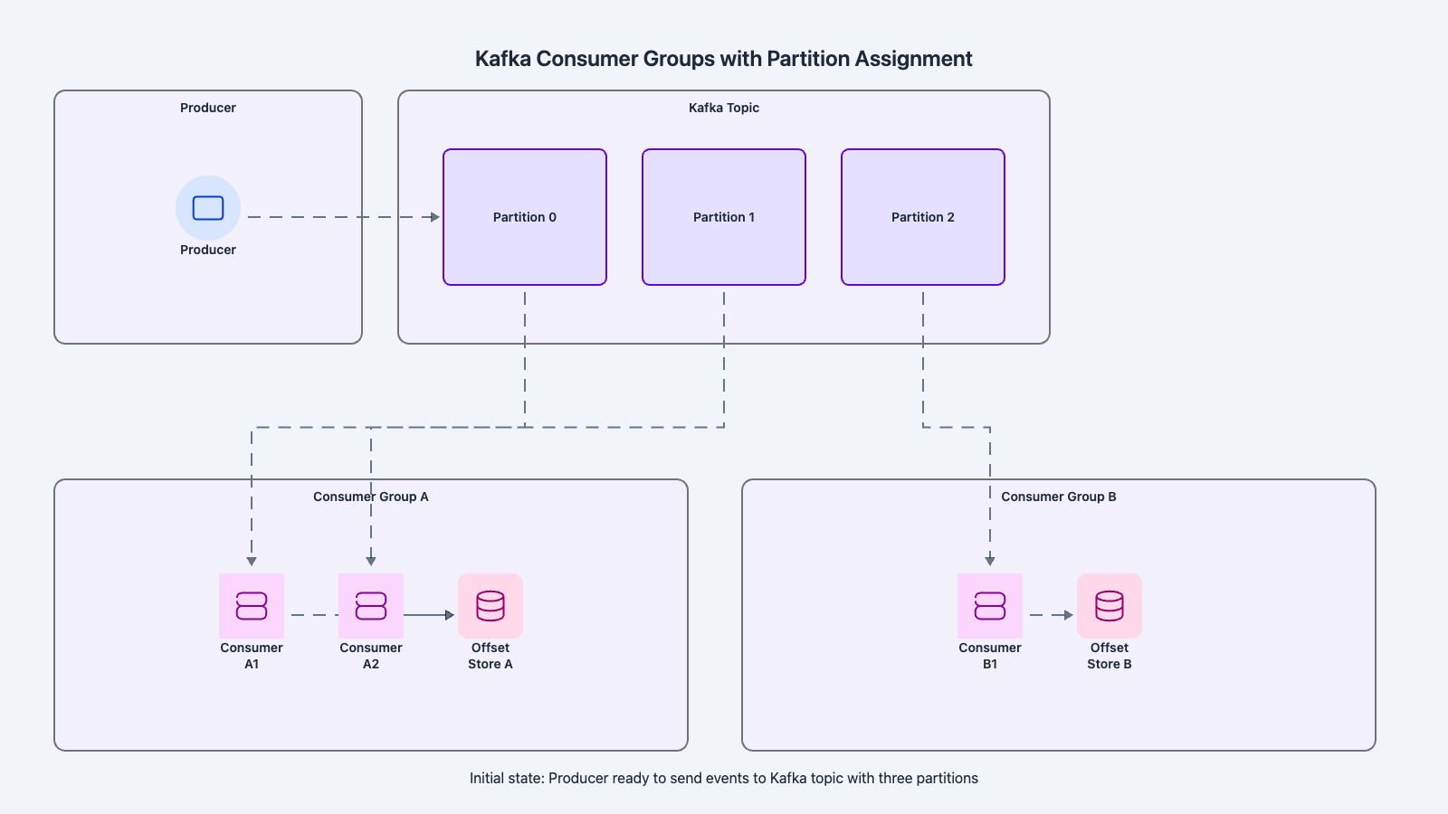 Within a group: partitions are divided among consumers. Each message is processed by exactly one consumer in the group. This is the queue-like behavior.
