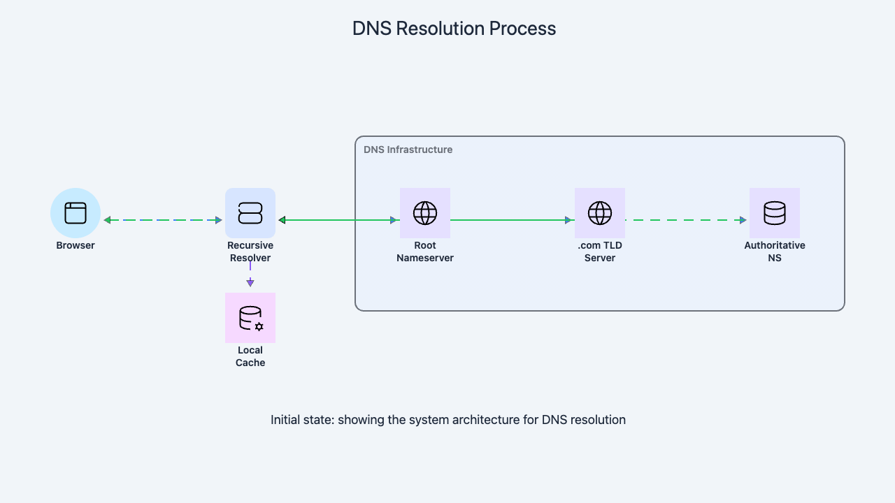 Step 2 — Recursive resolver. This is the workhorse of DNS. Typically run by your ISP, corporate network, or a public service like Cloudflare (1.1.1.1) or Google (8.8.8.8). The recursive resolver does all the heavy lifting — if it does not already have the answer cached, it walks the DNS hierarchy on your behalf. A busy recursive resolver can cache answers for thousands of domains, meaning most queries never leave this step.