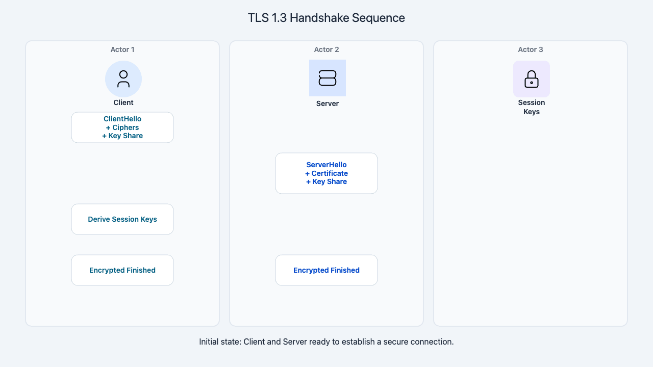 TLS 1.3 (finalized in RFC 8446, 2018) completes the handshake in a single round trip (1-RTT), down from two round trips in TLS 1.2. Here is how it works:
