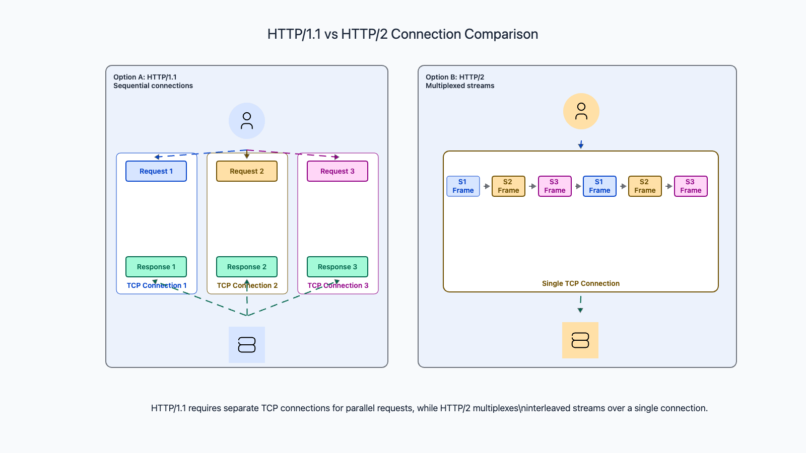 To work around this, browsers open 6 parallel TCP connections per origin (the browser-imposed limit). A page loading 30 resources uses all 6 connections, with each connection processing requests sequentially. This helps but creates its own problems: 6 TCP handshakes, 6 TLS handshakes, 6 congestion control windows competing for bandwidth, and 6 sets of buffers consuming server memory.