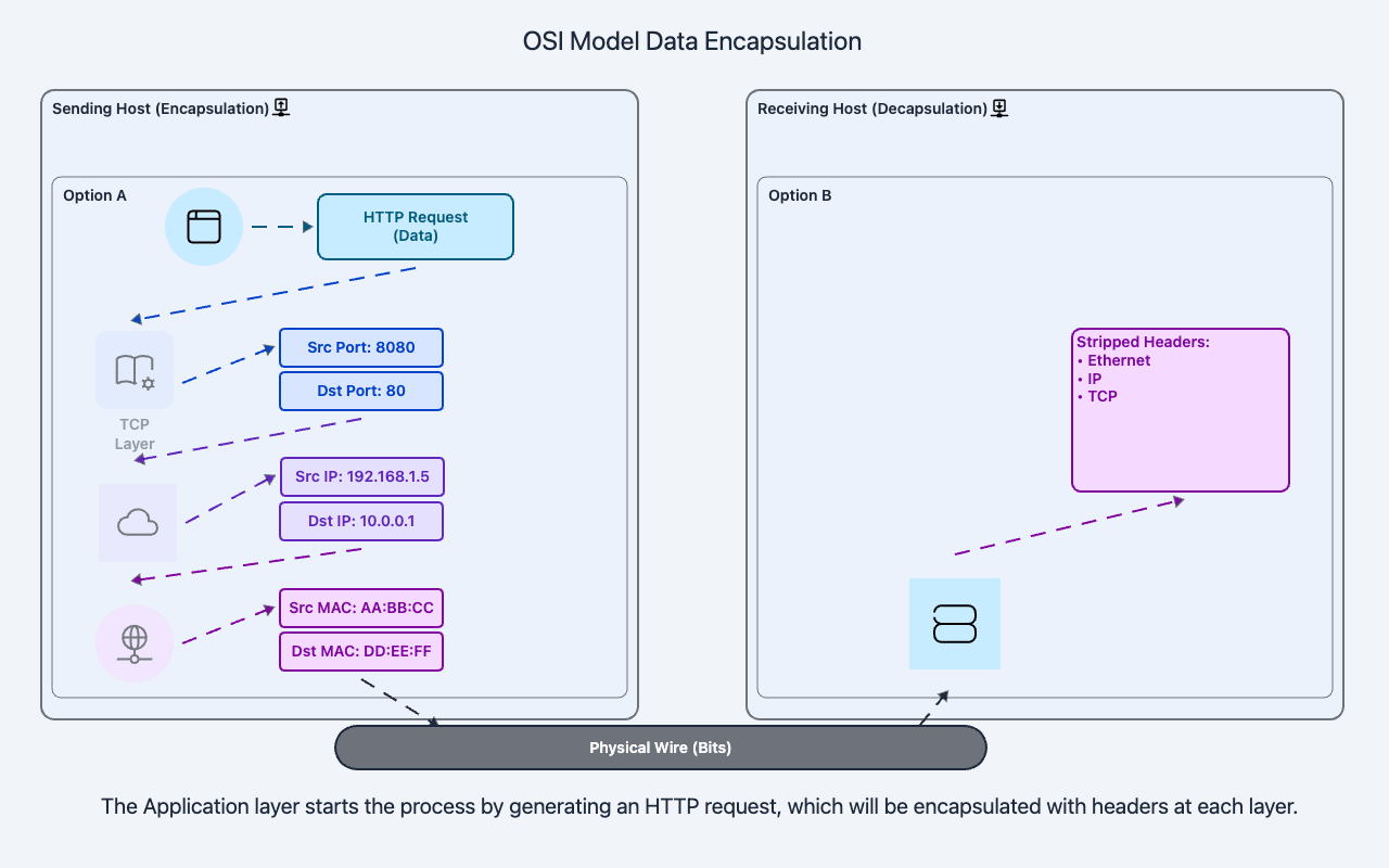 The network stack wraps your data in progressively lower-level envelopes. Your HTTP payload gets a TCP header (ports, sequence numbers), then an IP header (source/destination addresses, TTL), then an Ethernet frame (source/destination MACs). The receiving host strips each layer in reverse.