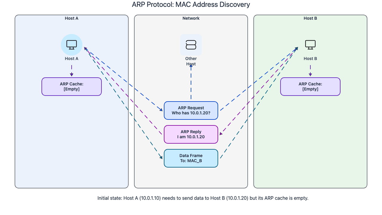 10.0.1.20 -> AA:BB:CC:DD:11:22) with a TTL (typically 20-300 seconds) - Host A constructs an Ethernet frame with B's MAC as destination and sends the packet