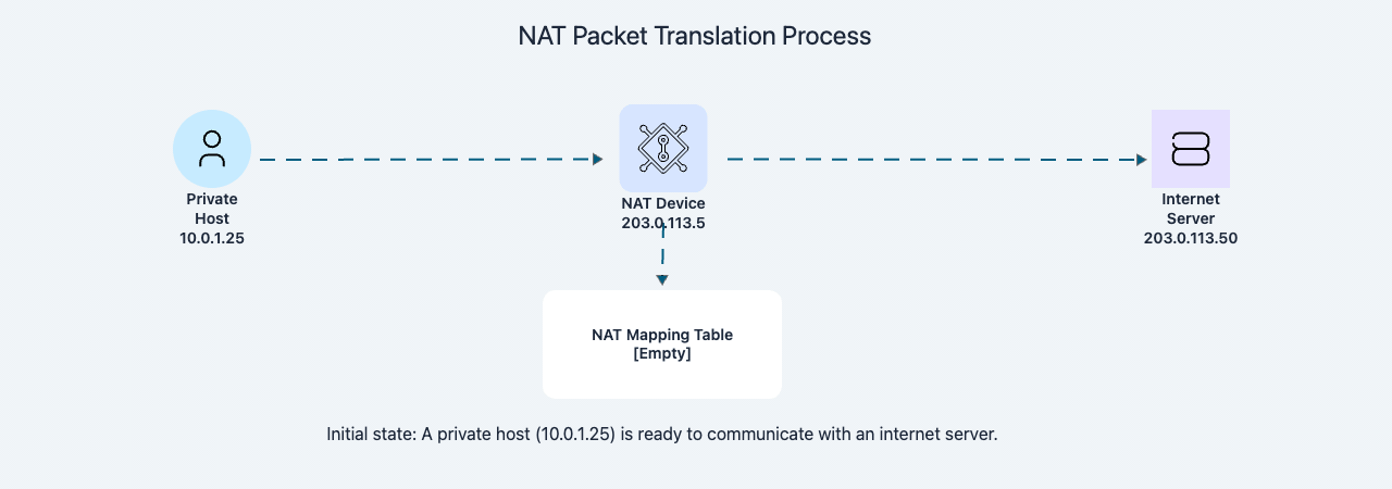 10.0.1.25:5151sends a TCP SYN to203.0.113.50:443 - The NAT device intercepts the packet and creates a mapping: