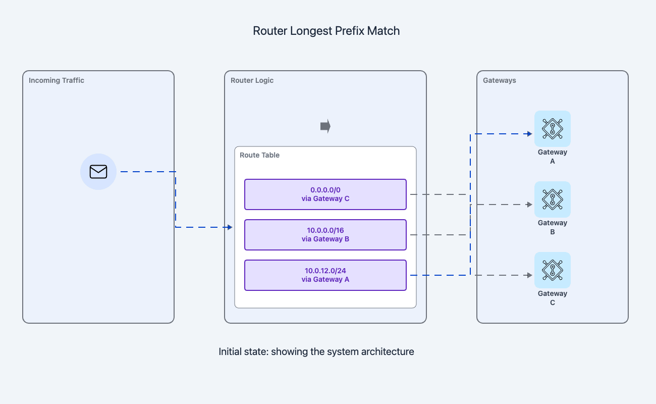 A packet arrives destined for 10.0.12.77. All three routes match this IP, but the /24 is the most specific (longest prefix), so the packet goes to Gateway A. If the destination were 10.0.5.99, only the /16 and /0 match, and the /16 wins. For 8.8.8.8, only the default /0 matches.