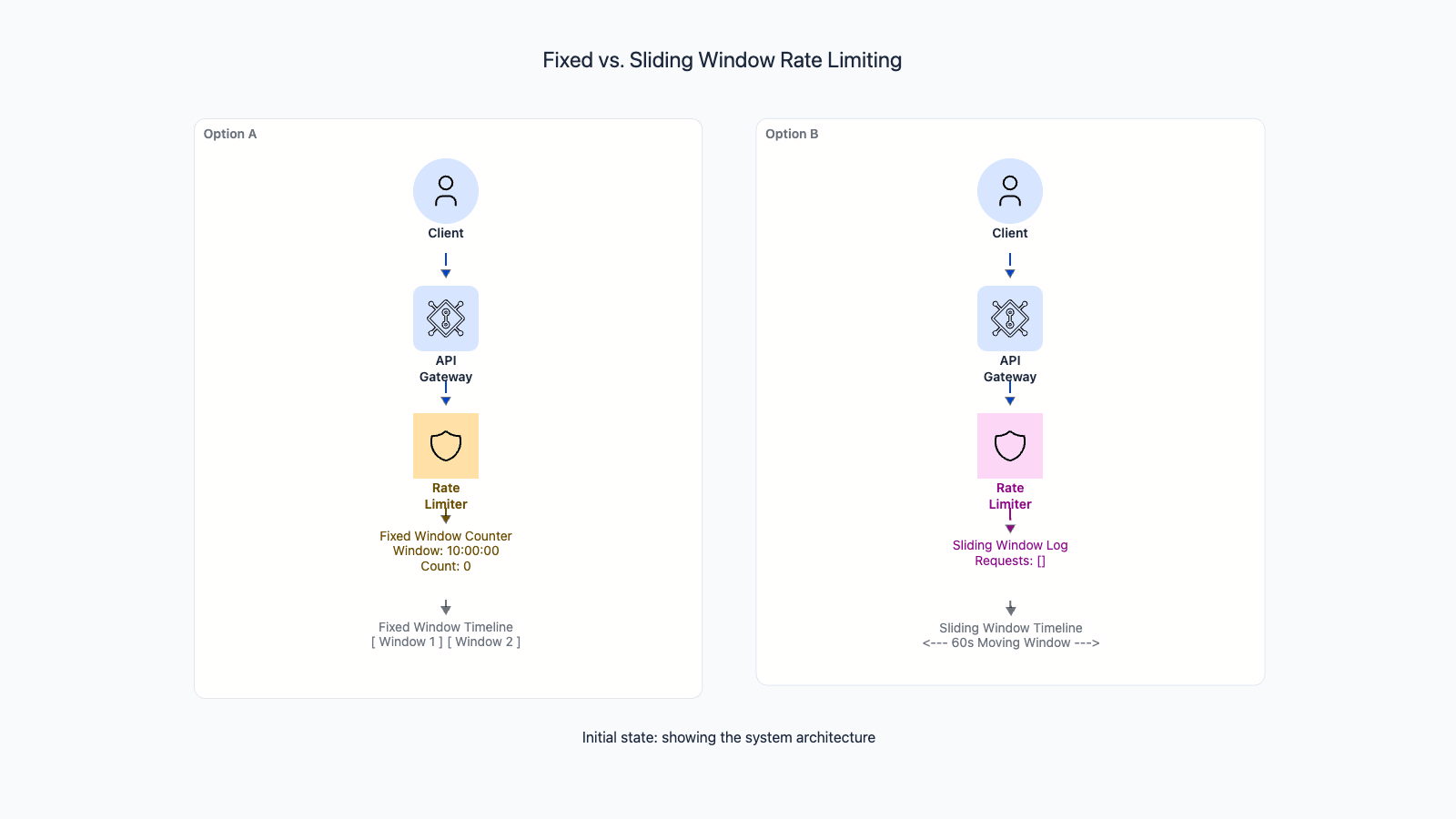 The fixed window boundary problem is not theoretical. If your API allows 1000 requests per minute with fixed windows, a client can send 2000 requests in 2 seconds by timing their burst across the window reset. Sliding window counter eliminates this with negligible overhead — use it as the default over fixed windows.