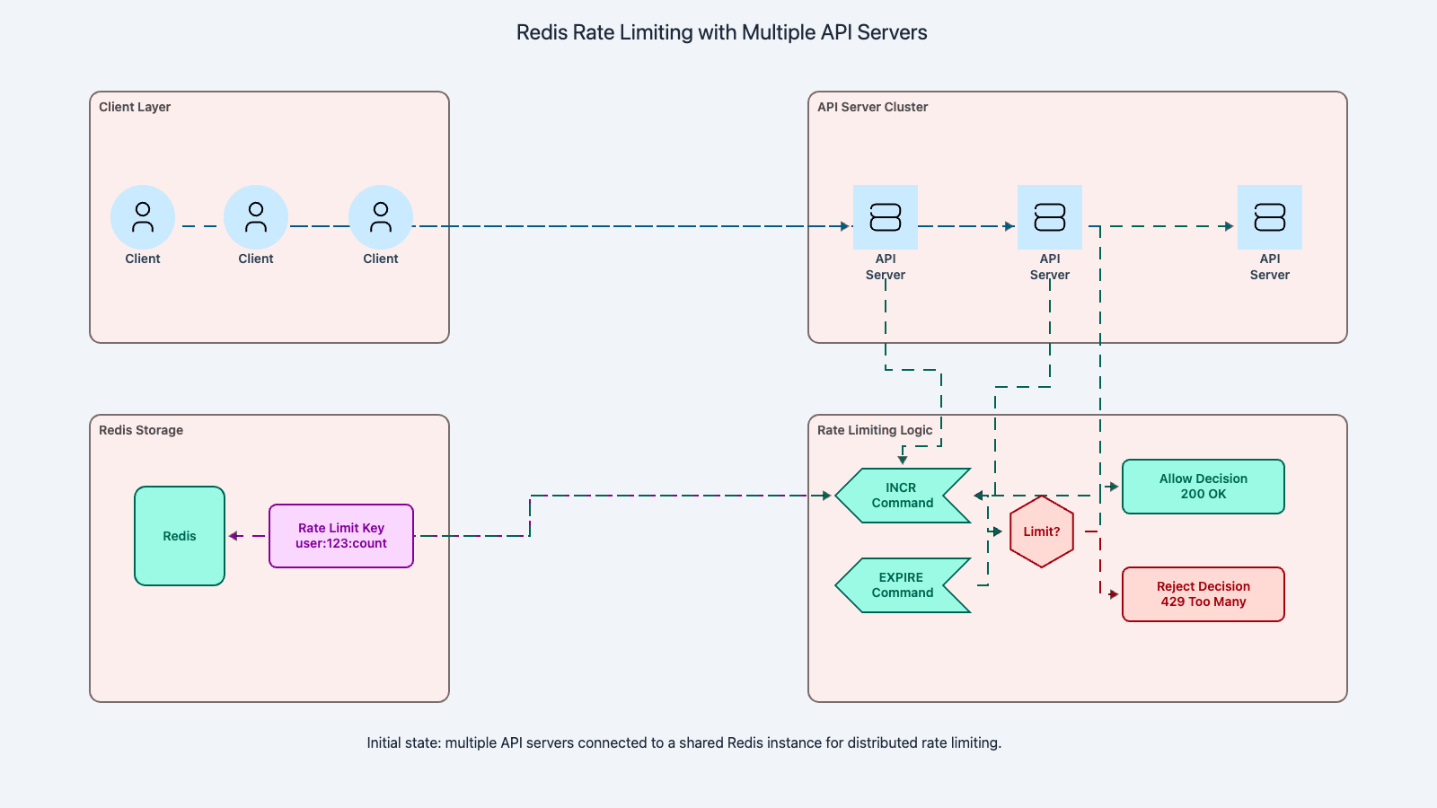 Rate limiting in a single-server environment is straightforward — an in-memory counter works. But production systems run behind multiple servers, each receiving a fraction of traffic. Without coordination, each server enforces its own limit independently, allowing clients to exceed the global limit by distributing requests across servers.