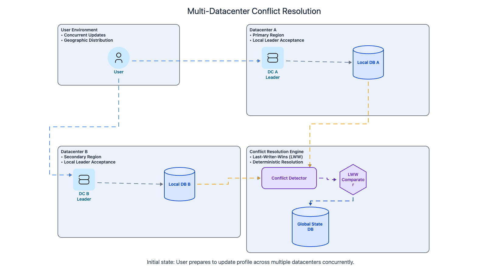 User A in Tokyo updates their display name to "Alice" on Leader-Tokyo. Simultaneously, User A (from a different device) in New York updates it to "Alicia" on Leader-Virginia. Both writes succeed locally. When the leaders replicate to each other, they discover two concurrent writes to the same row. This is a write conflict.