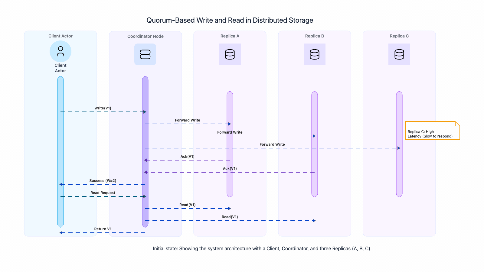 Example: N=3, W=2, R=2. A write to nodes A, B, C succeeds when any 2 acknowledge. A read queries any 2 nodes. Since W+R = 4 > 3, at least one node in the read set participated in the write — so the reader gets the latest value (it picks the one with the higher version number).