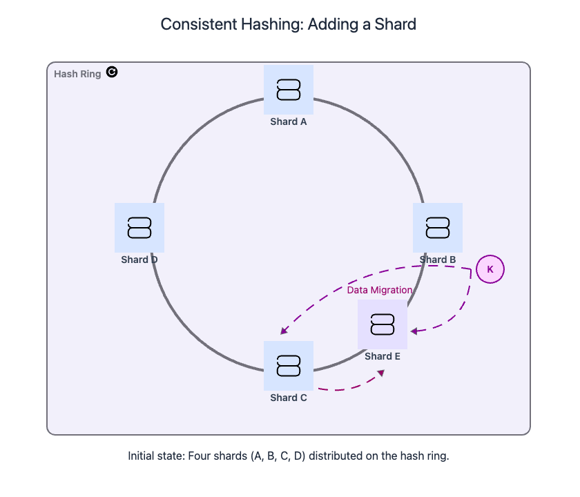 Consistent hashing solves this by placing both shards and keys on a circular hash ring. Each key maps to the next shard clockwise on the ring. When you add a shard, it claims only the arc between itself and its predecessor. Only the keys in that arc migrate, roughly 1/N of the total. Every other key stays on its current shard.