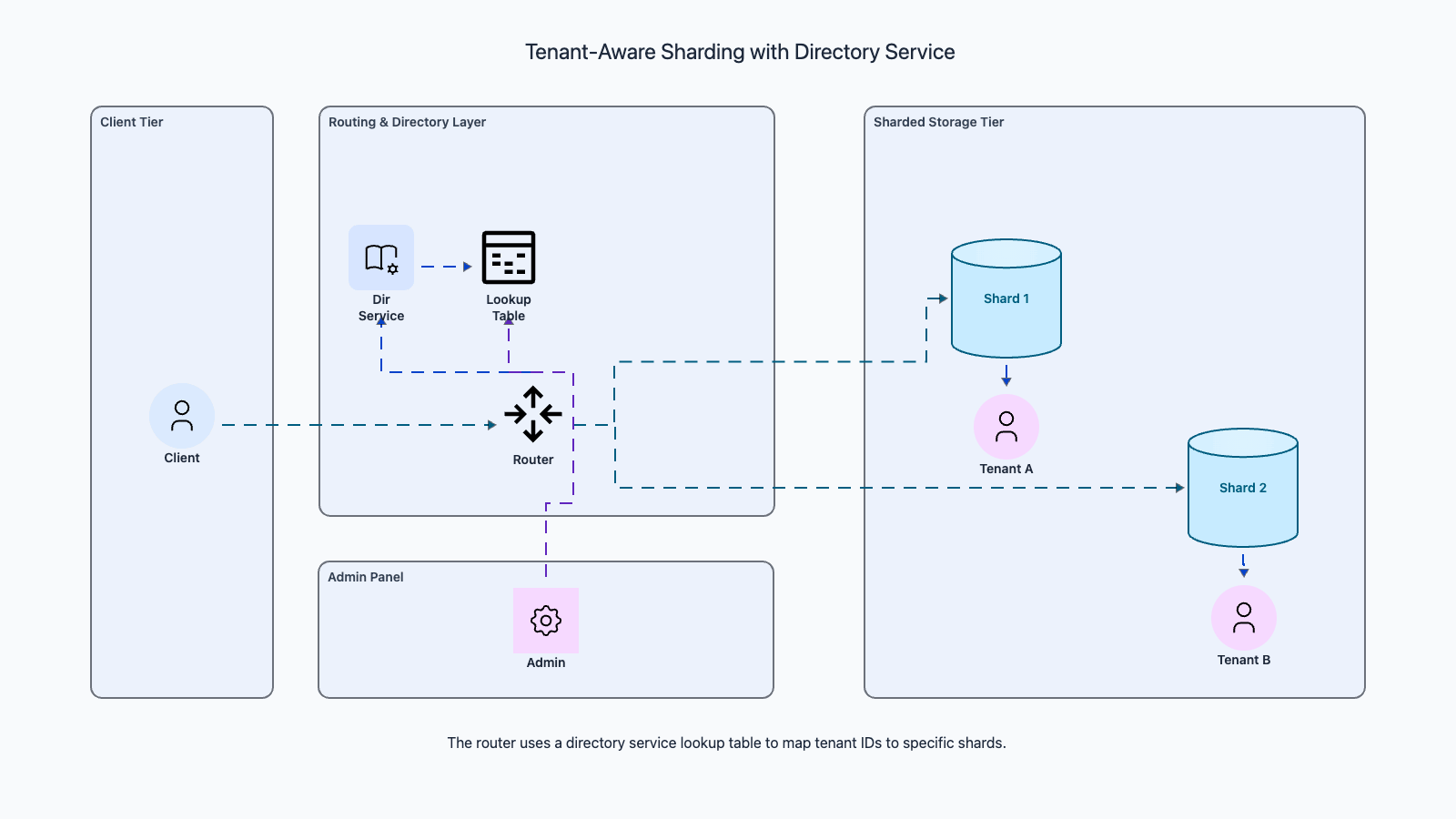 Directory sharding uses a lookup table that maps each key (or tenant) to a shard. It gives you maximum control, including the ability to isolate large tenants on dedicated shards, but introduces a lookup service that becomes a critical dependency. Best for multi-tenant SaaS with varying tenant sizes and compliance requirements.