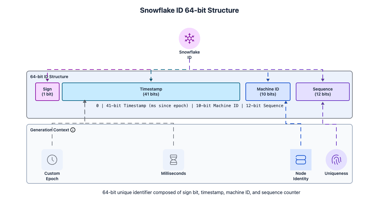- Sign bit (1 bit) — always 0, keeps the ID positive in signed 64-bit integer types.