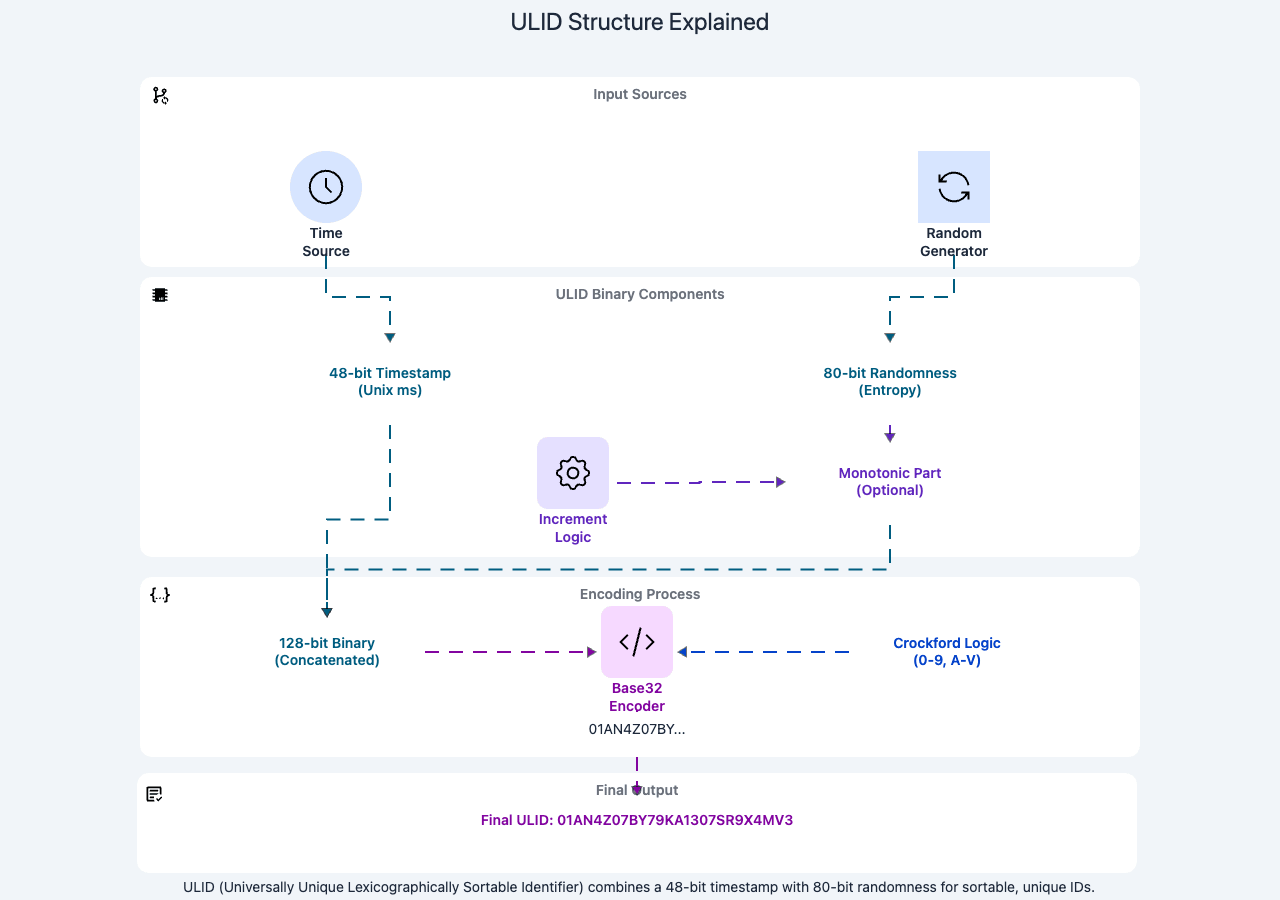 ULID was designed as a drop-in replacement for UUID v4 that adds one critical property: lexicographic sorting equals chronological sorting. Like UUID v4, a ULID is 128 bits and needs no coordination. Unlike UUID v4, you can sort a column of ULIDs as plain strings and get creation-time order.